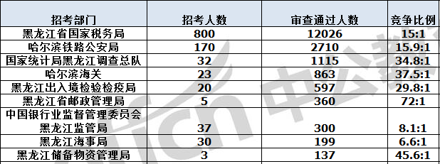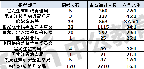 報名通過審核人數前十的職位主要集中在黑龍江省國家稅務局、哈爾濱鐵路公安局、黑龍江省郵政管理局等部門,具體信息如下:
