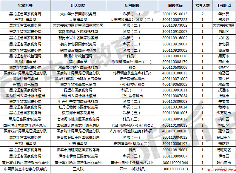 截止到5日16時,工作地點在黑龍江的職位共有40個職位無人通過審核,有27個職位無人報名,下面是無人報考職位一覽表,中公網(wǎng)校專家建議廣大考生多關注一些較冷職位,避免激烈競爭,結合自身條件,找到屬于自己的職位。