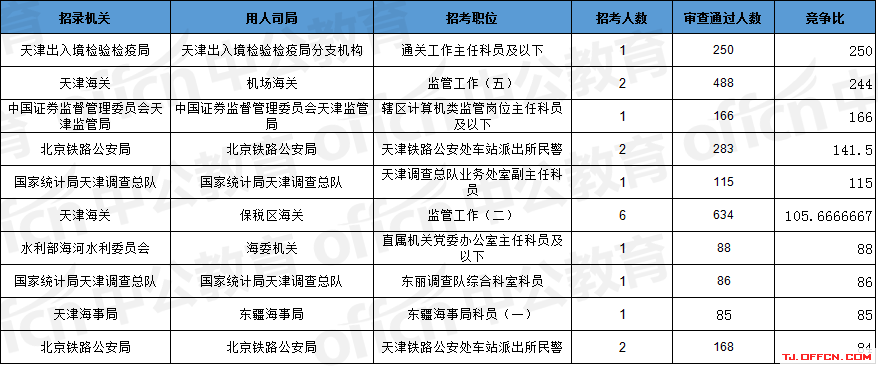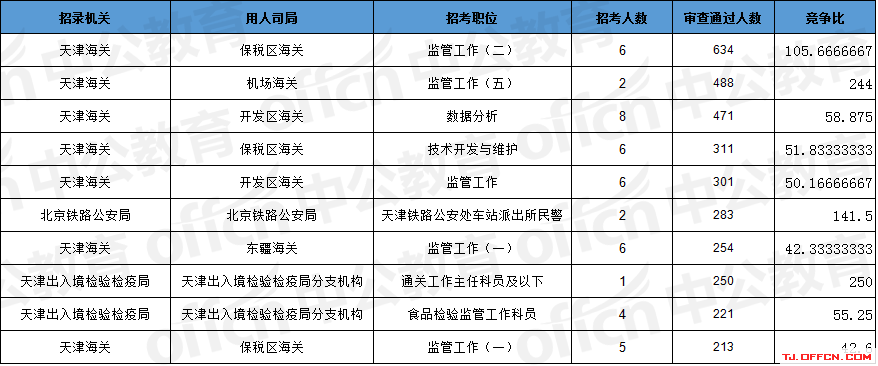 報名通過審核人數前十的職位主要集中在天津海關、北京鐵路公安局、天津出入境檢驗檢疫局等部門,具體信息如下: