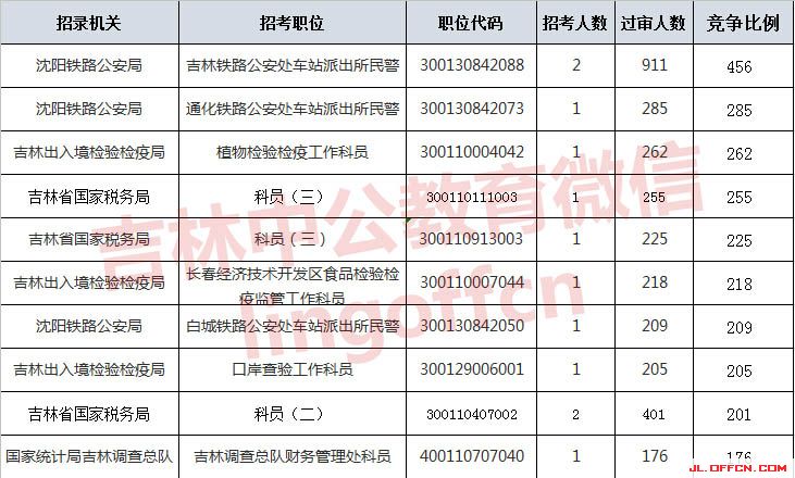 報(bào)名通過審核人數(shù)前十的職位主要集中在沈陽鐵路公安局、吉林國(guó)家稅務(wù)局等部門,具體信息如下: