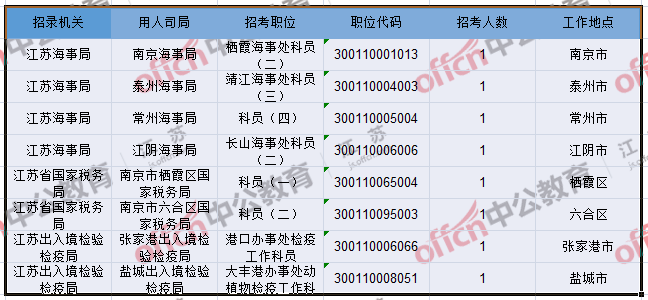 截止到6日16時(shí),工作地點(diǎn)在江蘇的職位共有8個(gè)無(wú)人報(bào)考,占全部職位的0.67%。下面是無(wú)人報(bào)考職位一覽表,中公網(wǎng)校專家建議廣大考生多關(guān)注一些較冷職位,避免激烈競(jìng)爭(zhēng),結(jié)合自身?xiàng)l件,找到屬于自己的職位。