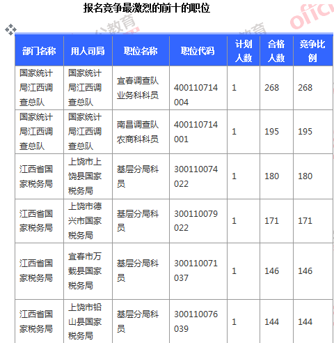 截止到6日16時,競爭比例的職位為國家統(tǒng)計局江西調(diào)查總隊國家統(tǒng)計局江西調(diào)查總隊宜春調(diào)查隊業(yè)務(wù)科科員一職,招錄1人,截止到6日16時通過人數(shù)為268人,位列第二的國家統(tǒng)計局江西調(diào)查總隊國家統(tǒng)計局江西調(diào)查總隊南昌調(diào)查隊農(nóng)商科科員一職,為195:1