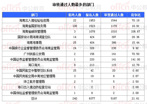 為幫助廣大考生更清晰的了解今日報名情況,中公網(wǎng)校整理了審核通過人數(shù)的部門以及競爭比例最激烈的部門,供廣大考生參考: