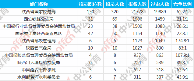 截至到7日16時,通過審核人數前三位的部門依次是:陜西省國家稅務局、西安鐵路公安局、國家統計局陜西調查總隊,三部門通過審核總人數達22488人,占通過審核總人數的80.4%。