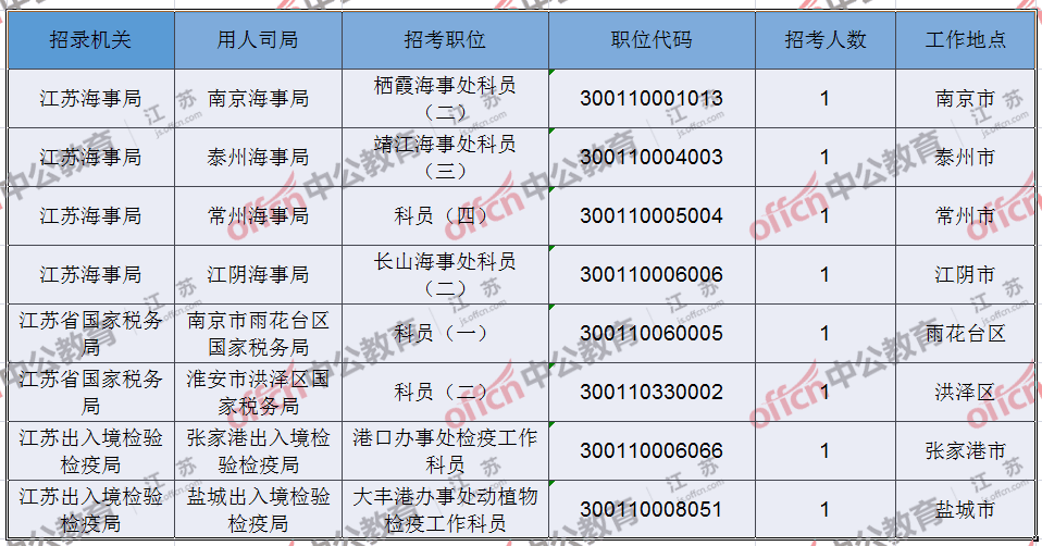 截止到6日16時,工作地點在江蘇的職位共有8個無人報考,占全部職位的0.67%。下面是無人報考職位一覽表,中公網校專家建議廣大考生多關注一些較冷職位,避免激烈競爭,結合自身條件,找到屬于自己的職位。