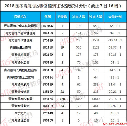 以下是7日16時各部門報名人數統計分析,其中中國民航青海安全監督管理局、青海省物資儲備管理局、青海省郵政管理局等三個部門競爭最激烈,競爭比均已超過219:1。