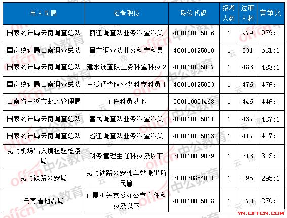 當(dāng)前最受歡迎的崗位是國(guó)家統(tǒng)計(jì)局云南調(diào)查總隊(duì),麗江調(diào)查隊(duì)業(yè)務(wù)科室科員,職位代碼:400110125006,招錄1人,1013人報(bào)名,其中34人待審核通過(guò),詳情如下圖: