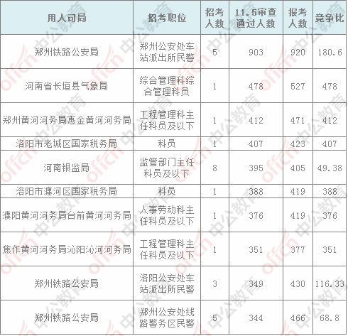 報(bào)名通過審核人數(shù)前十的職位主要集中在鄭州鐵路公安局、河南省氣象局、河南省國家稅務(wù)局,具體信息如下: