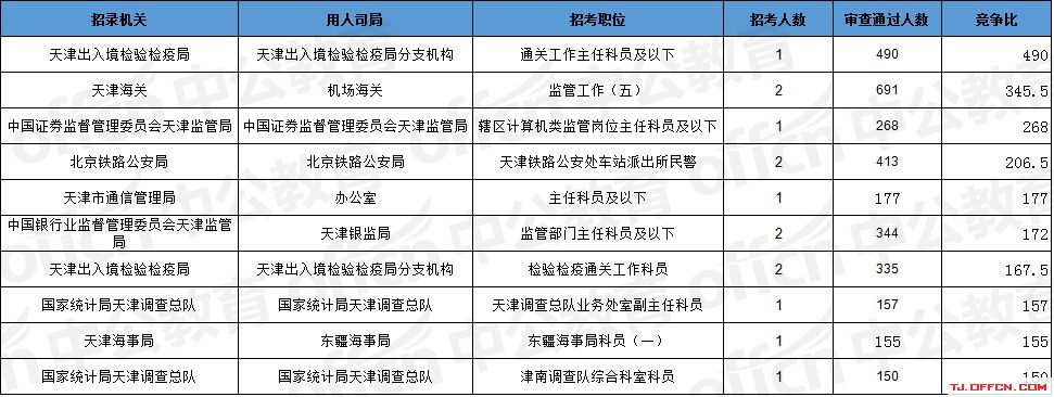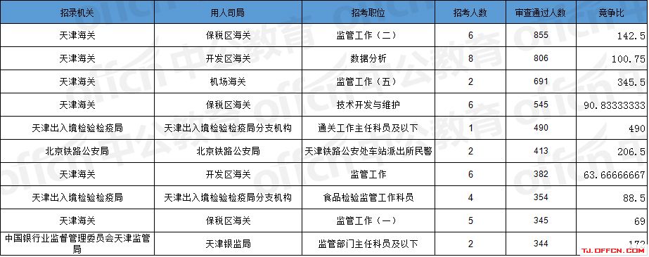 報名通過審核人數前十的職位主要集中在天津海關、北京鐵路公安局、天津出入境檢驗檢疫局等部門,具體信息如下: