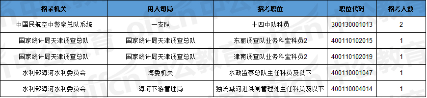 截止到8日09時,工作地點在天津的職位共有5個無人報考,占全部職位的2.4%。下圖是無人報考職位一覽表,中公網校專家建議廣大考生多關注一些較冷職位,避免激烈競爭,結合自身條件,找到屬于自己的職位。