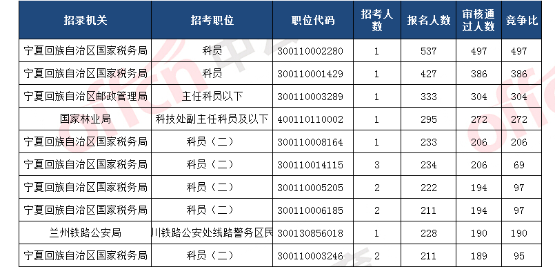 截止到11月8日9時,報名通過審核人數(shù)前十的職位主要為寧夏回族自治區(qū)國家稅務局、寧夏回族自治區(qū)郵政管理局,具體信息如下: