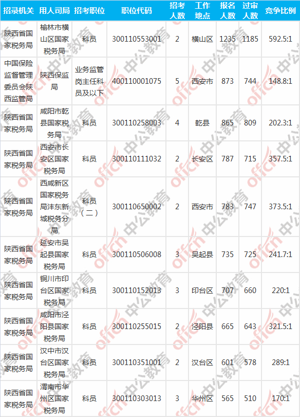 截至到8日9時,競爭比例的職位為陜西省榆林市橫山區國家稅務局科員一職,招錄2人,截至到8日9時報名人數為1235人,通過審核人數為1185人,競爭比例592.5:1!