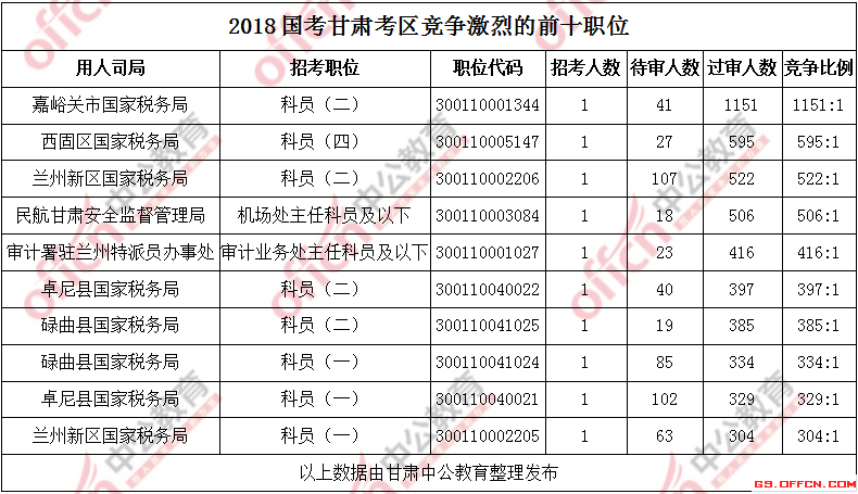 報名通過審核人數前十的職位主要集中在嘉峪關市國家稅務局、西固區國家稅務局、蘭州新區國家稅務局,具體信息如下: