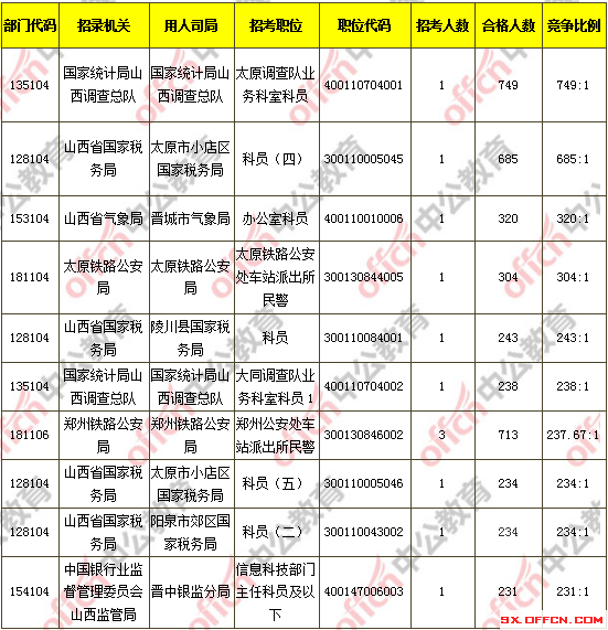 報名通過審核人數前十的職位主要集中在國家統計局山西調查總隊、鄭州鐵路公安局、山西省國家稅務局等部門,具體信息如下: