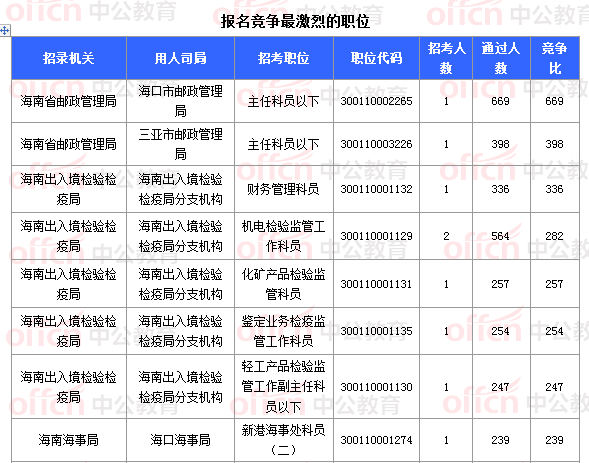 截止到8日16時,競爭比例的職位為海南省郵政管理局海口市郵政管理局主任科員以下一職,招錄1人,截止到8日16時通過人數為669人。