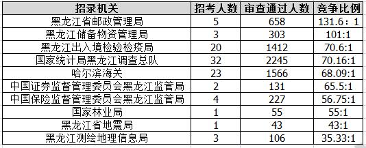 截止到11月8日16時(shí),通過審核人數(shù)前三位的部門依次是:黑龍江省國家稅務(wù)局、哈爾濱鐵路公安局、國家統(tǒng)計(jì)局黑龍江調(diào)查總隊(duì),三部門通過審核總?cè)藬?shù)達(dá)31093人,占通過審核總?cè)藬?shù)的83.44%。其中黑龍江省國稅局審核通過人數(shù),與去年同期相比增加了7165人。