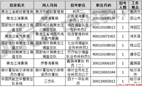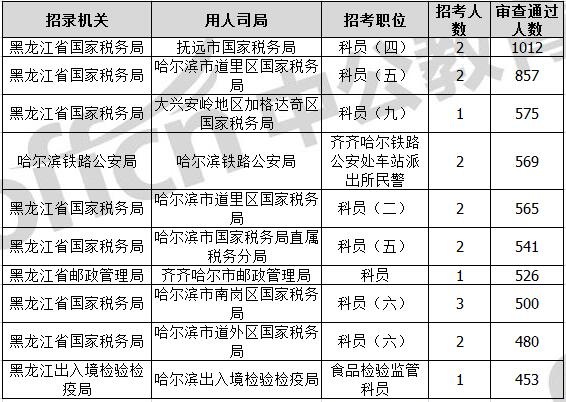 報(bào)名通過(guò)審核人數(shù)前十的職位主要集中在黑龍江省國(guó)家稅務(wù)局、哈爾濱鐵路公安局、黑龍江省郵政管理局等部門(mén),具體信息如下: