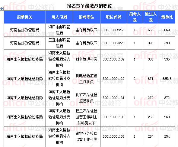 截止到8日17時30分,競爭比例的職位為海南省郵政管理局海口市郵政管理局主任科員以下一職,招錄1人,截止到8日17時30分通過人數為669人。