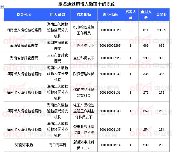 報名通過審核人數前十的職位主要集中在海南省郵政管理局、海南出入境檢驗檢疫局、海南海事局等部門,具體信息如下: