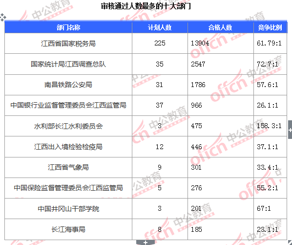 截止到8日17:30時,通過審核人數前三位的部門依次是:江西省國家稅務局、國家統計局江西調查總隊、南昌鐵路公安局,三部門通過審核總人數達18237人,占通過審核總人數的85.3%。