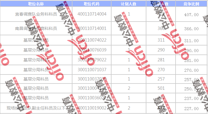 截止到8日17:30時,競爭比例的職位為國家統計局江西調查總隊國家統計局江西調查總隊宜春調查隊業務科科員一職,招錄1人,截止到8日17:30時通過人數為407人,競爭比為407:1