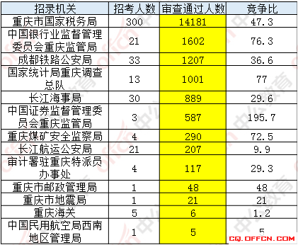 截至11月8日17:30時,據重慶中公網校統計,經過了近10天的報名后,國考職位中工作地點在重慶的職位通過審核總人數為20161人,比去年同期21111人減少950人,共有4個職位無人通過審核,其中一個職位無人報考,平均競爭比例為46.1:1,比去年同期競爭比34.8:1有所增幅。審核通過人數相對減少與國考重慶地區此次招錄名額減少有關系,也很有有可能和這次招錄條件相對較嚴有關。