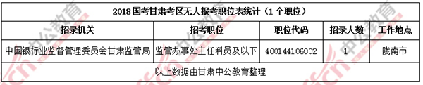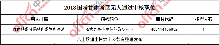 11月8日17:30,工作地點(diǎn)在甘肅的職位共有1個(gè)職位無人通過審核,占全部職位的0.5%,1個(gè)職位無人報(bào)考,占全部職位的0.5%。下面是無人待審及無人報(bào)報(bào)職位一覽表,中公網(wǎng)校專家建議廣大考生多關(guān)注一些較冷職位,避免激烈競爭,結(jié)合自身?xiàng)l件,找到屬于自己的職位。