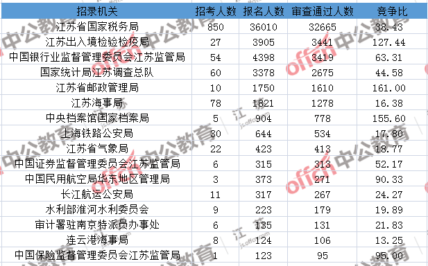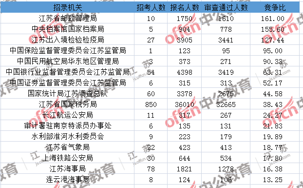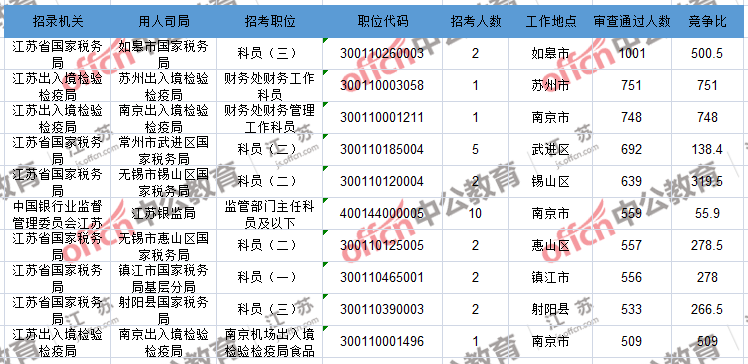 報(bào)名通過審核人數(shù)前十的職位主要集中在江蘇出入境檢驗(yàn)檢疫局、江蘇省郵政管理局、江蘇省國家稅務(wù)局等部門,具體信息如下:
