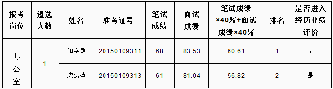 根據(jù)《怒江州2015年州級機關(guān)公開遴選公務(wù)員和參照公務(wù)員法管理單位工作人員公告》要求,面試由遴選單位負責(zé)實施,現(xiàn)將中共怒江州委黨史研究室公開遴選公務(wù)員面試成績及進入業(yè)績評價人員名單公告如下: