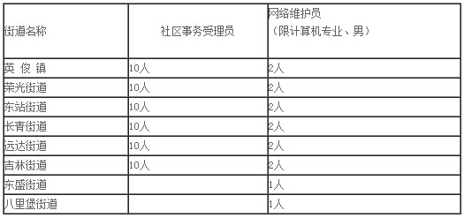 為進(jìn)一步推進(jìn)二道區(qū)社區(qū)公共服務(wù)綜合信息平臺(tái)試點(diǎn)建設(shè),現(xiàn)面向社會(huì)公開招聘社區(qū)事務(wù)受理服務(wù)中心工作者,現(xiàn)將有關(guān)事項(xiàng)公告如下: