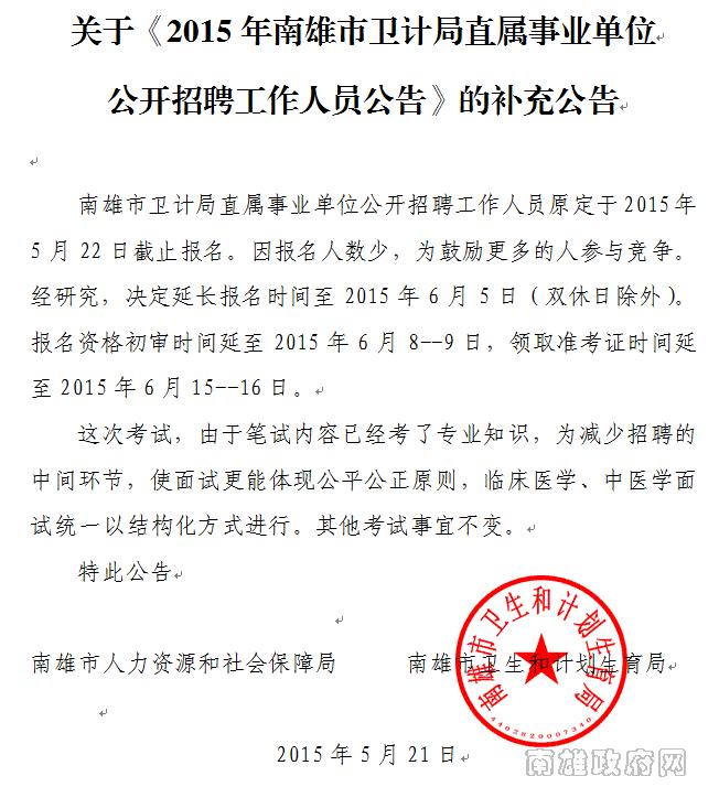 2015年廣東省南雄市衛(wèi)計局直屬事業(yè)單位招聘補(bǔ)充公告