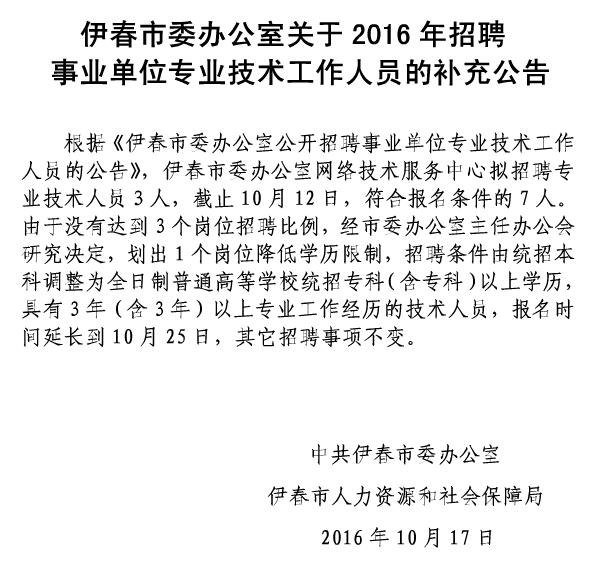 原標題:伊春市委辦公室關于2016年招聘事業單位專業技術工作人員的補充公告