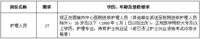 因我院工作需要,現(xiàn)面向正在恩施市中心醫(yī)院進修中人員招聘護理人員17名,相關事宜公告如下: