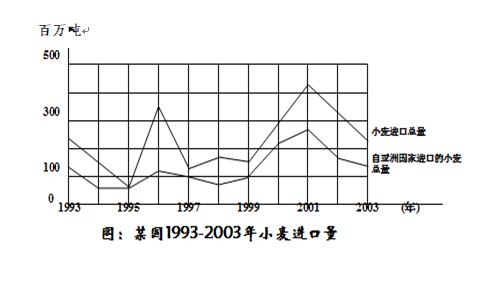 解析:從1993年到1997年共計5個年份,根據圖示,該國共從亞洲國家進口小麥約為450百萬噸;該國小麥進口量曲線在200百萬噸以上的年份共有六個,故題2答案為C;題3問該國在哪一年,自亞洲以外其他國家進口的小麥數量最多,根據題意:小麥進口總量減去自亞洲國家進口小麥總量即為自亞洲以外其他國家進口的小麥數量,由圖可見1996年該值為,故答案為D。