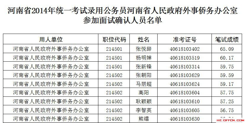根據省委組織部、省人力資源和社會廳、省公務員局2014年統一考試錄用公務員工作有關規定,現將河南省人民政府外事僑務辦公室面試資格確認有關事宜通知如下: