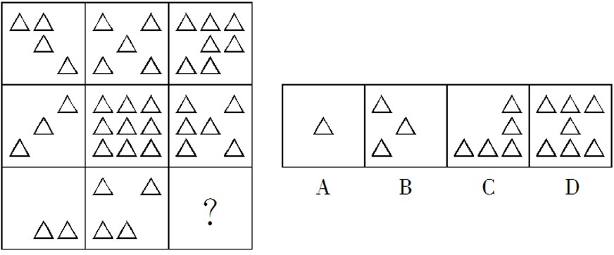 76.從所給的四個(gè)選項(xiàng)中,選擇最合適的一個(gè)填入問號(hào)處,使之呈現(xiàn)一定的規(guī)律性。