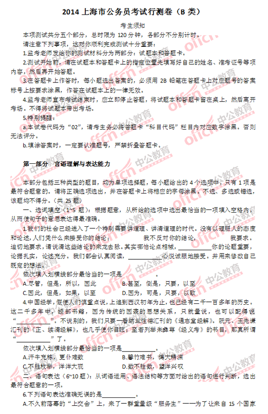 2014上海市公務(wù)員考試行測(cè)(B類(lèi))